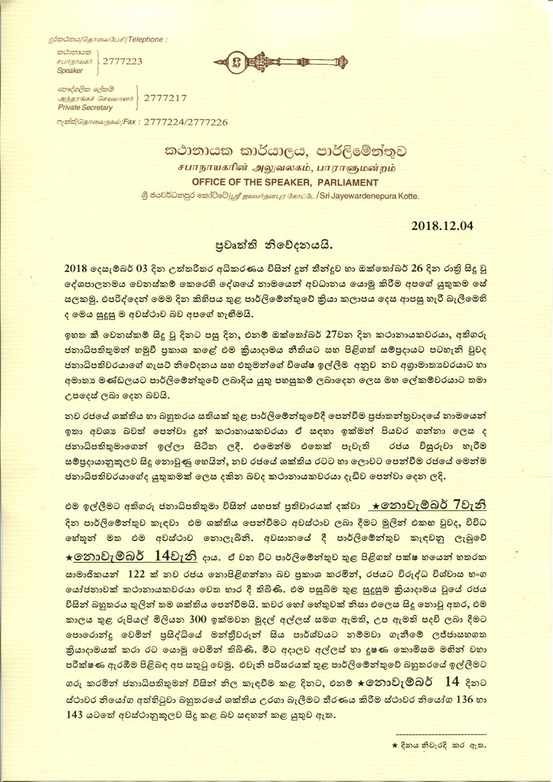 මෑත අතීතයේ දී රටේ දේශපාලන, සමාජීය හා ආර්ථික යහපැවැත්ම පිරිහී ඇති බව මෙම නිවේදනයේ වැඩිදුරටත් සඳහන් වේ. ඊළඟ පාර්ලිමේන්තු සැසියෙන් පසු පාර්ලිමේන්තුව නැවත යථා තත්ත්වයට පත් කිරීම සඳහා සියලු පක්ෂ නායකයින් අත්වැල් බැඳ ගත යුතු බවයි මෙහිදී කථානායකවරයා අවධාරණය කර සිටින්නේ.