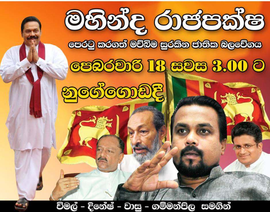 අද පස්වරු 03.00ට නුගේගොඩ ආනන්ද සමරකෝන් එළිමහන් පීඨයේ දී රැළිය පැවැත්වීමට නියමිතයි. හිටපු අමාත්යවරුන් වන දිනේෂ් ගුණවර්ධන, විමල් වීරවංශ, වාසුදේව නානායක්කාර සහ උදය ගම්මන්පිල යන මහත්වරුන් මෙම රැළිය සංවිධාන කර තිබෙනවා.