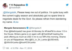 තමන් රග්බි තරගවාරය හේතුවෙන් කර්ය බහුන වී ඇති නිසා රජය වෙනුවෙන් ගනුදෙනු කිරීම සඳහා වෙලාවක් නොමැති බව යෝෂිත රාජපක්ෂ මහතා පවසයි. පාර්ලිමේන්තු මන්ත්රී මංගල සමරවීර මහතා එල්ල කරන චෝදනා සම්බන්ධයෙන් පිළිතුරු ලබාදෙමින් ඔහු මේ බව සඳහන් කරයි.