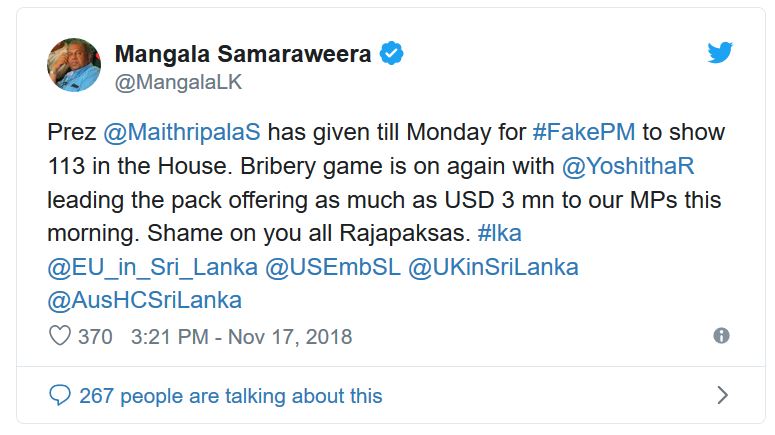 ඔහු පෙන්වා දෙන්නේ මන්ත්රීවරයෙක් මිලට ගැනීම වෙනුවෙන් යෝෂිත රාජපක්ෂ මහතා ඩොලර් මිලියන තුනක් ලබාදෙන බවයි. ඒ අනුව පාර්ලිමේන්තුවේ නැවතත් අංක තරගය ආරම්භ වී ඇති බවත් ඔහු පෙන්වා දෙයි.