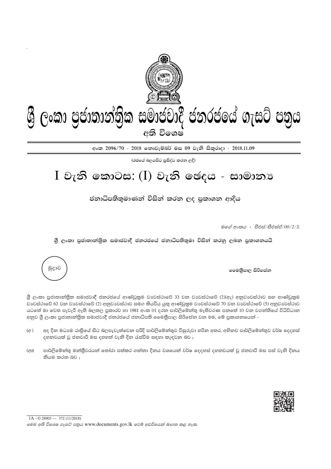 මේ අනුව මහ මැතිවරණය 2019 ජනවාරි මස 05 වෙනිදාට පැවැත්වීමට තීරණය කර ඇත. අභිනව පාර්ලිමේන්තුව ජනවාරි මස 17 වෙනිදා රැස්වීමට තීරණය කර ඇති බවයි එම ගැසට් නිවේදනය මගින් නිවේදනය කර තිබෙනවා.