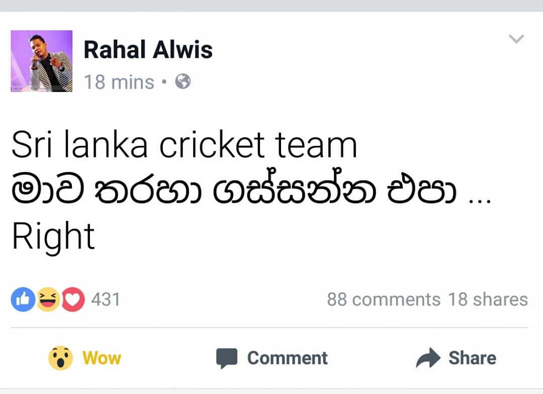 පසුගිය දිනවල කට නිසා ජනප්රිය වු ගායක රහල් අල්විස්, තමන්ට ශ්රී ලංකා පාකිස්තාන තරගය නරඹද්දී ඇතිවු හැගීම මෙසේ තම Facebook මත සටහන් කර තිබුනා.