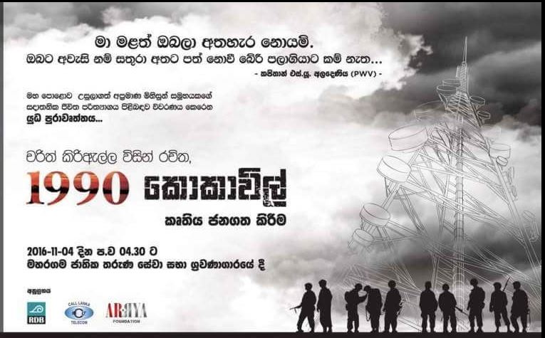 1990 කොකාවිල් ඛේදවාචකය ඔබට මතකද? ඔබ ඒ ගැන අසා තිබේනවාද? අපගේ ආදරණිය රණවිරුවන් සතුරා අතට කදවුර පත් නොවන්නට ජීවිත පරිත්යාගයෙන් කල සටන! අවසානයේ සතුරා සමගම විනාශ වන්න ගුවන් ප්රහාර තමන් සිටින කදවුරටම එල්ල කරගනිමින් සතුරා මාරාගෙන මැරුණු විරුවන් අපගේ සදාකාලික මතකයට එක් කරමින් අද දින ජනගත වන 1990 කොකාවිල් කෘතිය. ඔබත් ඒ අවස්ථාවට මග නොහැර සහභාගිවන්න, එන්න අද සවස 4.00ට මහරගම ජාතික තරුණ සේවා සභාවට.අද අප අත්විදින නිදහස සදහා ඒකීය රටක් ඉතිරි කිරීමට මිනීමරු ත්රස්තයන් හමුවේ තම ජීවිත දන් දුන් ඒ ආදරණීයන් කාලයේ වැළිතලාවෙන් වැසි යන්න ඉඩ නොදෙමු.මුණගැසේමු අද සවස 4.00ට!!!