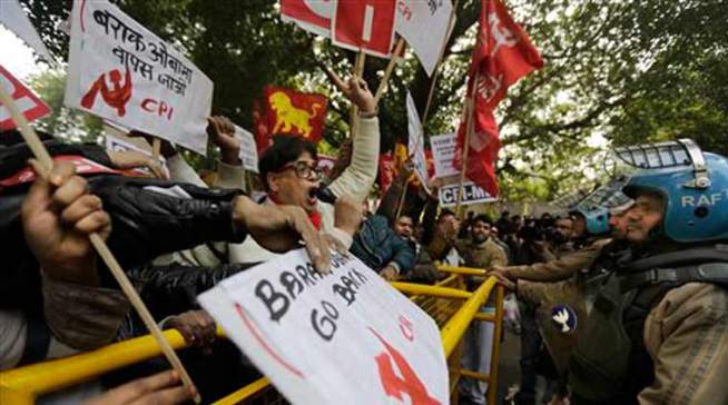 “Barack Obama, Hands Off India,” chanted nearly 100 protesters during their march in New Delhi.